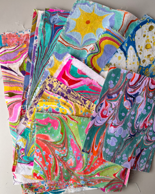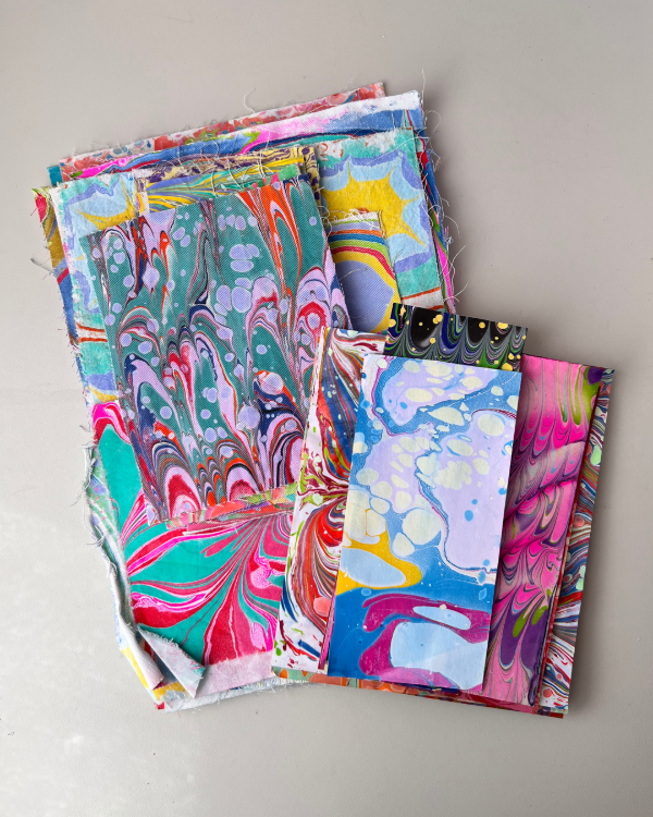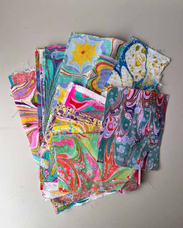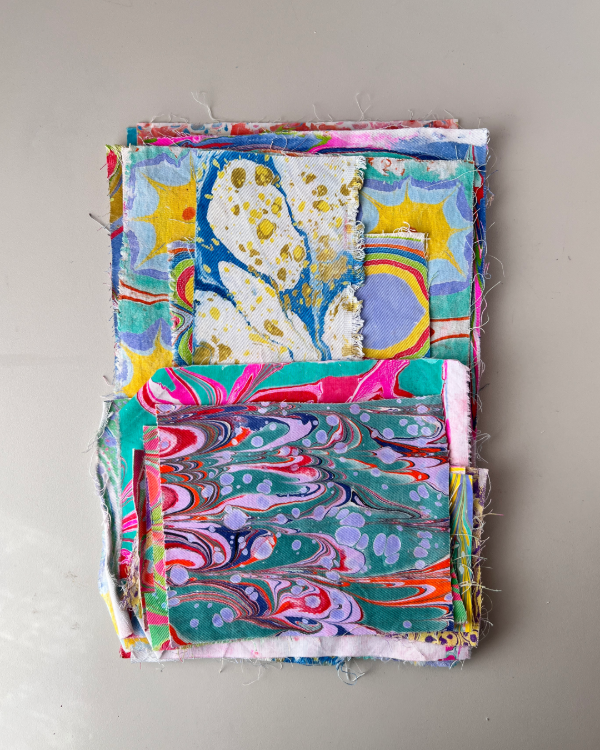 Cada sobre contienen varios recortes surtidos de telas marmoladas y, también, algunos papeles, todos originales y de diferentes tamaños.